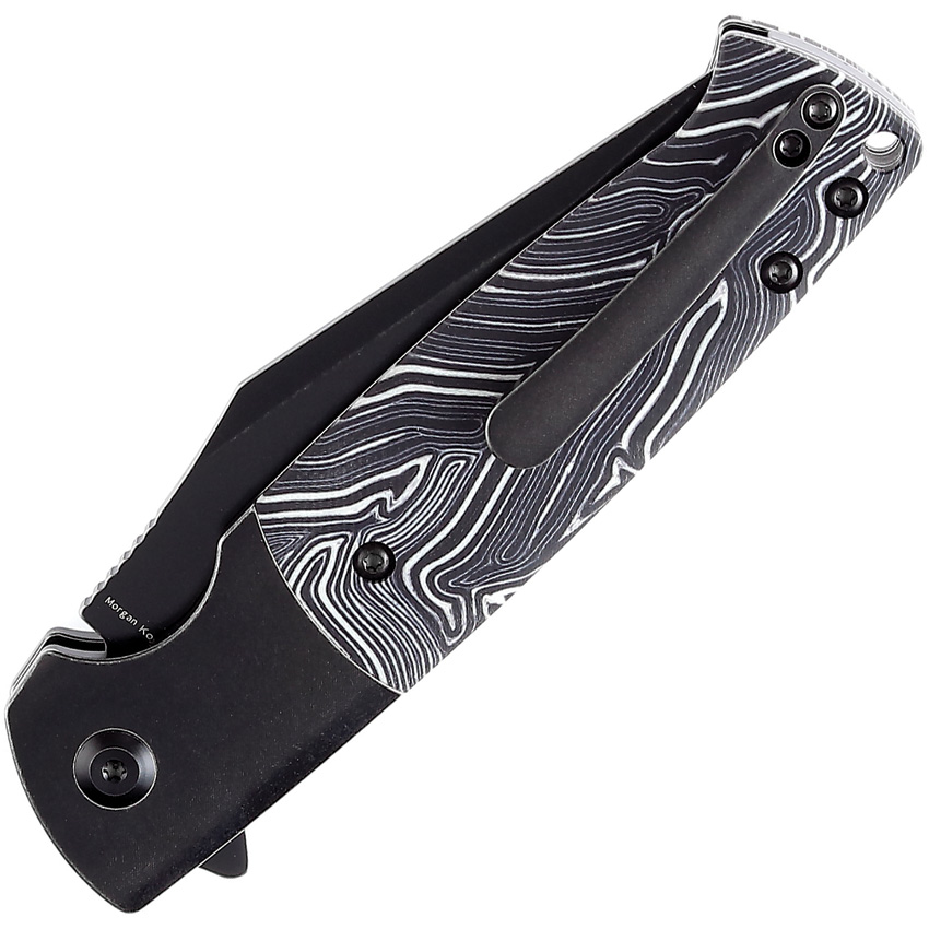 4.38″ (11.13cm) closed. 3.38″ (8.59cm) black stonewash finish CPM S35VN stainless clip point blade. Black and white G10 G-Mascus handle. Stainless bolster(s). Extended tang. Lanyard hole. Pocket clip. Black nylon pouch. Boxed.