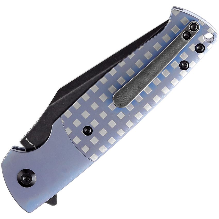 4.38″ (11.13cm) closed. 3.38″ (8.59cm) black stonewash finish CPM S35VN stainless clip point blade. Blue anodized titanium handle. Extended tang. Lanyard hole. Pocket clip. White square pattern handle. Black nylon pouch. Boxed.
