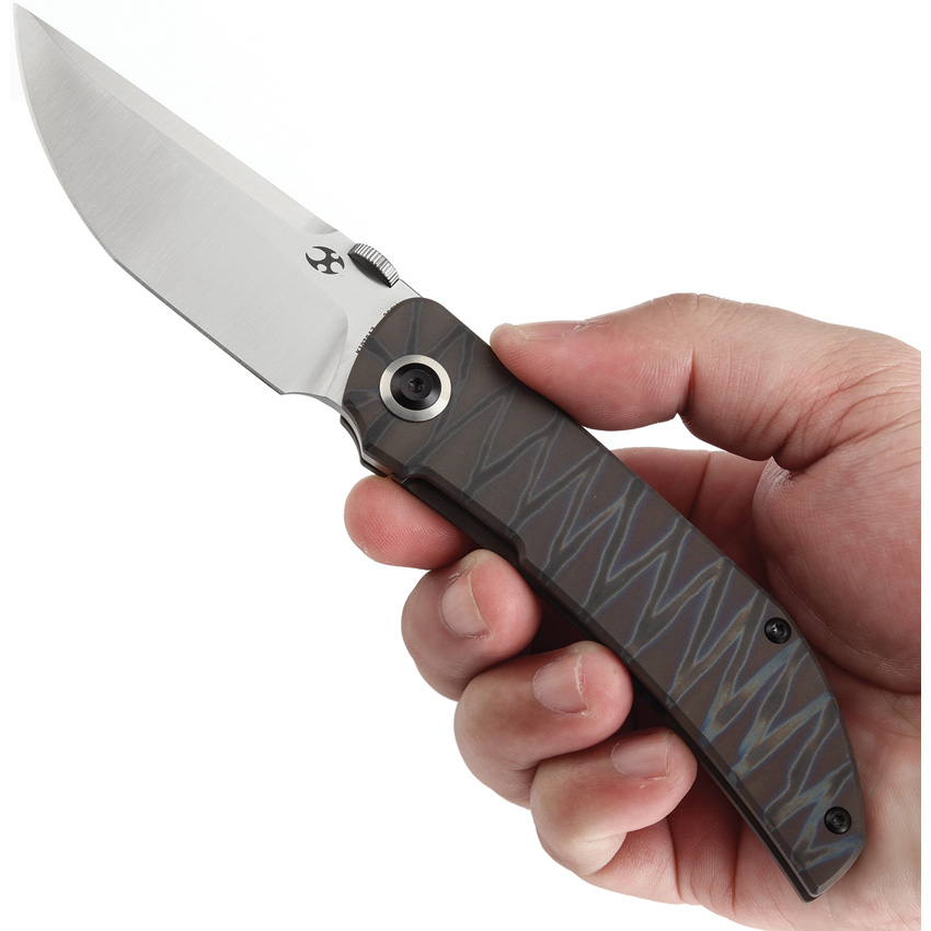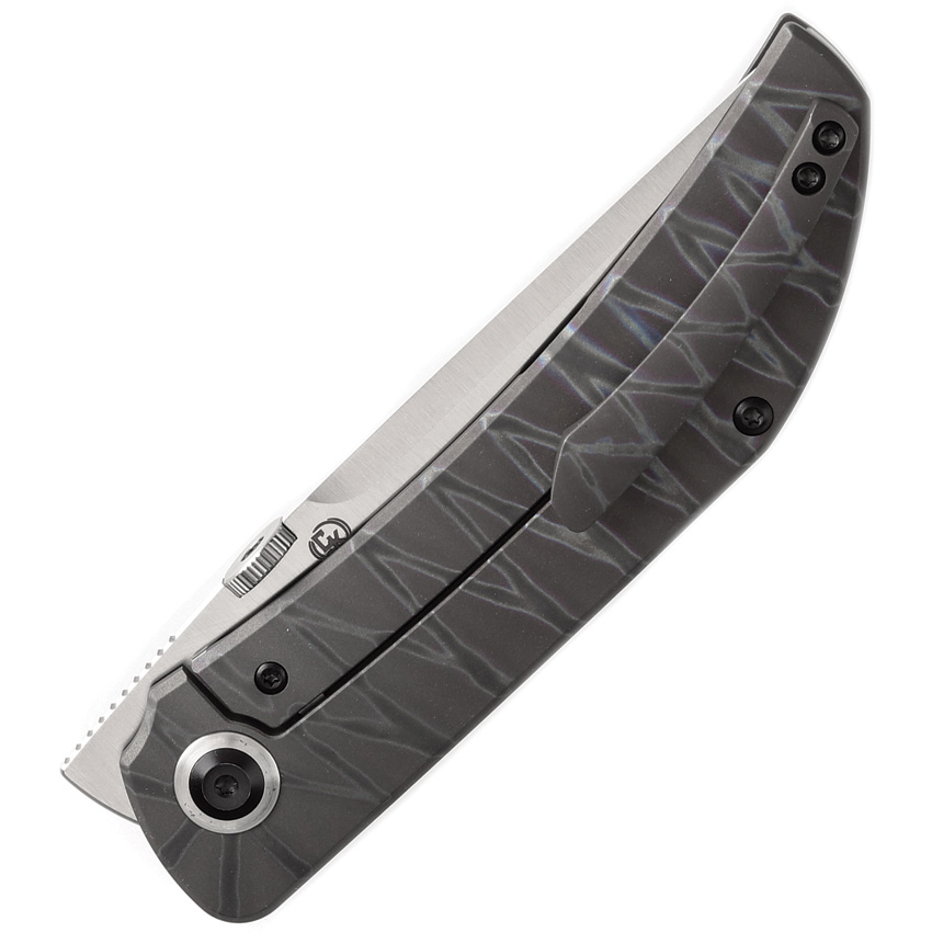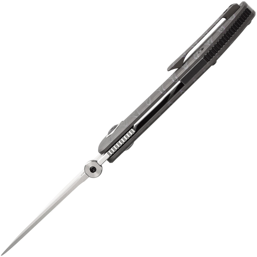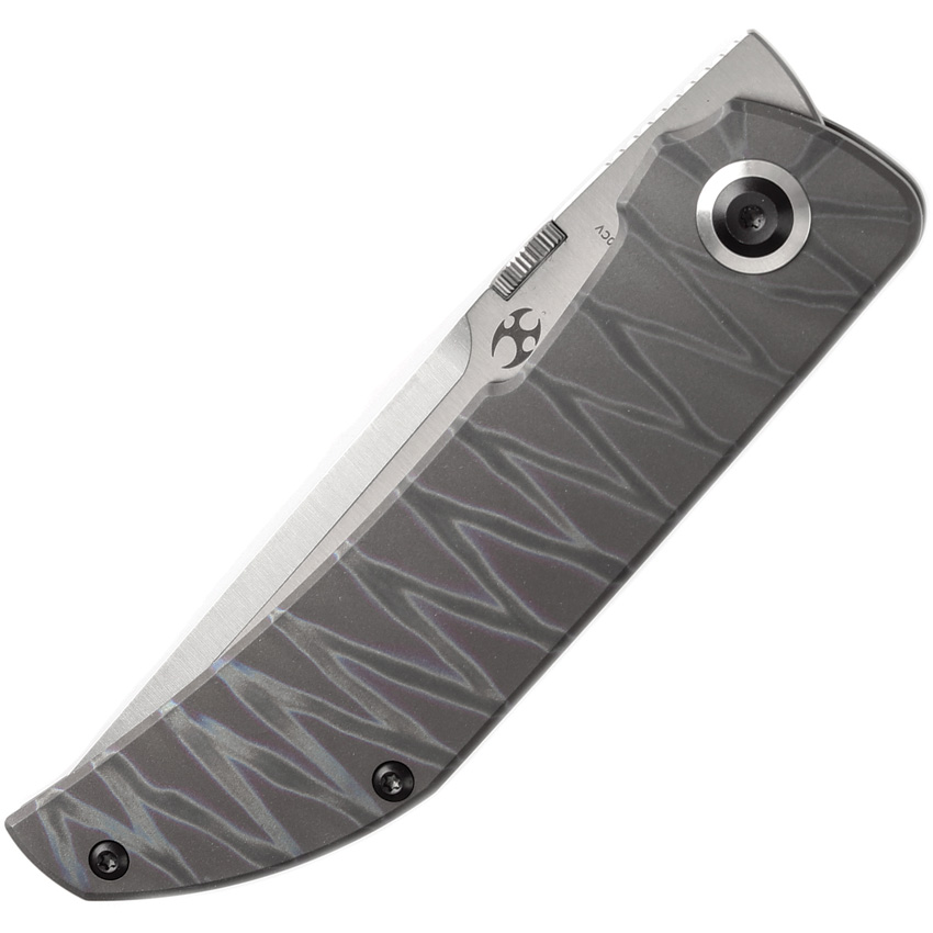 4.38″ (11.13cm) closed. 3.38″ (8.59cm) satin finish CPM-20CV stainless tanto blade. Flame anodized titanium handle. Thumb disk. Extended tang. Pocket clip. Black nylon pouch. Boxed.