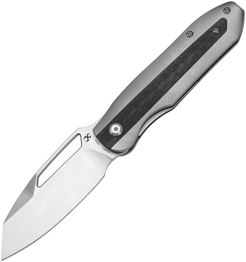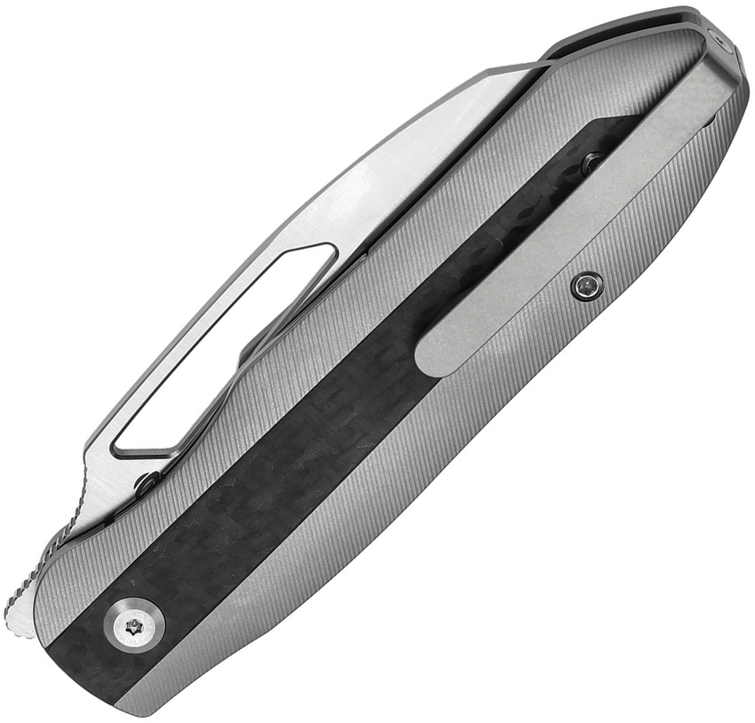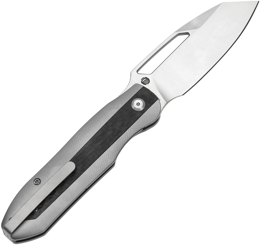 4.63″ (11.76cm) closed. 3.63″ (9.22cm) satin finish CPM S35VN stainless reverse tanto blade. Bead blast finish titanium handle with Twill carbon fiber inlay. Extended tang. Thumb pull. Pocket clip. Black nylon pouch. Boxed.