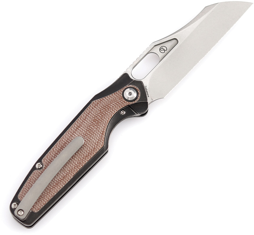 4.5″ (11.43cm) closed. 3.5″ (8.89cm) satin finish CPM-20CV stainless blade. Black stonewash finish titanium handle with brown micarta inlay. Pocket clip. Thumb pull. Black nylon pouch. Boxed.