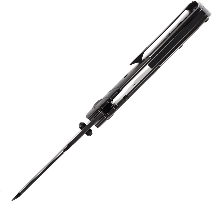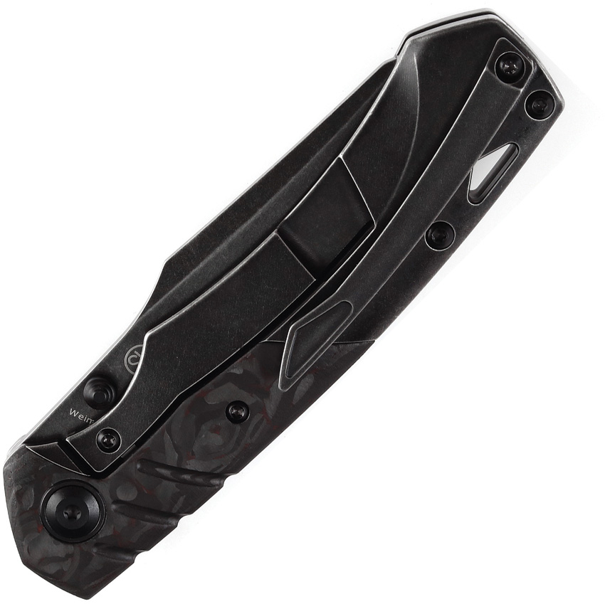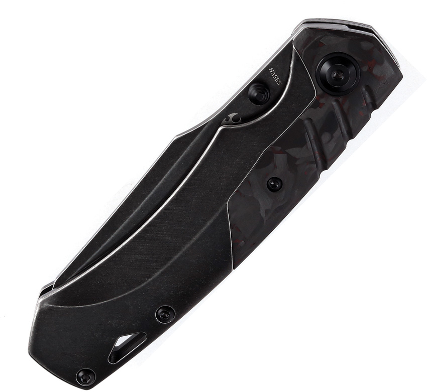 4.25″ (10.8cm) closed. 3.25″ (8.26cm) black stonewash finish CPM S35VN stainless sheepsfoot blade. Black stonewash finish titanium handle with Black and red carbon fiber inlay. Thumb stud. Lanyard hole. Pocket clip. Black nylon pouch. Boxed.