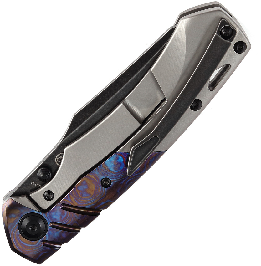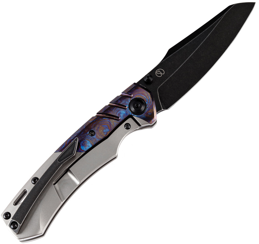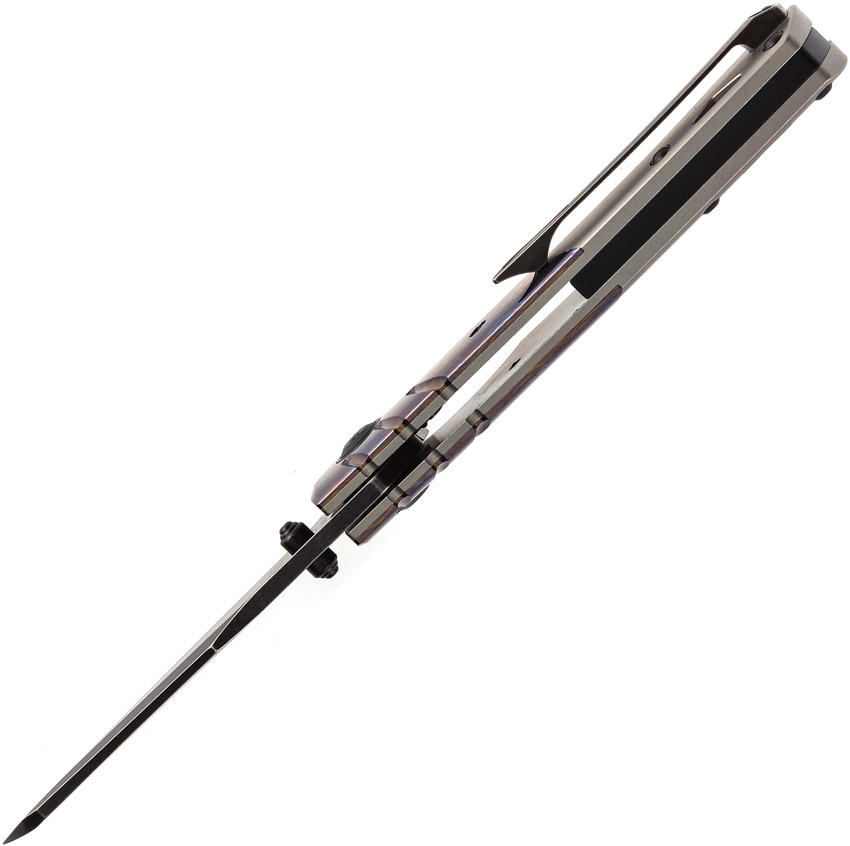 4.25″ (10.8cm) closed. 3.25″ (8.26cm) black stonewash finish CPM S35VN stainless sheepsfoot blade. Gray titanium handle with Timascus inlay. Thumb stud. Lanyard hole. Pocket clip. Black nylon pouch. Boxed.
