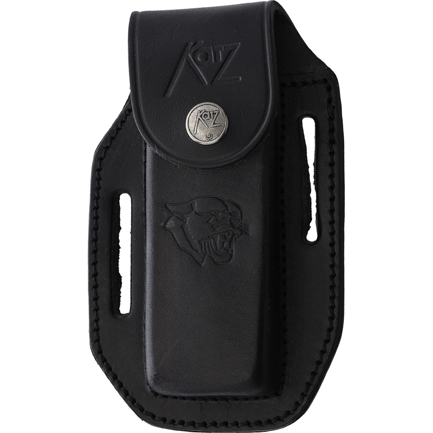 5″ (12.7cm) closed. 4″ (10.16cm) satin finish stainless drop point blade. Black Kraton handle. Stainless bolster(s). Thumb disk. Black leather belt sheath. Boxed.