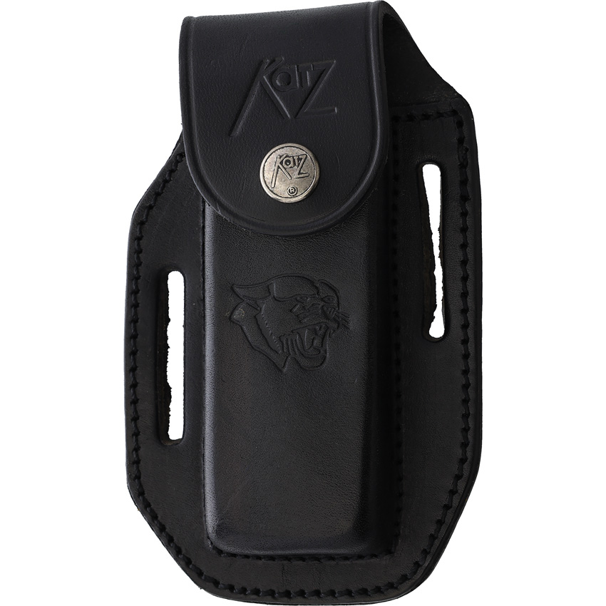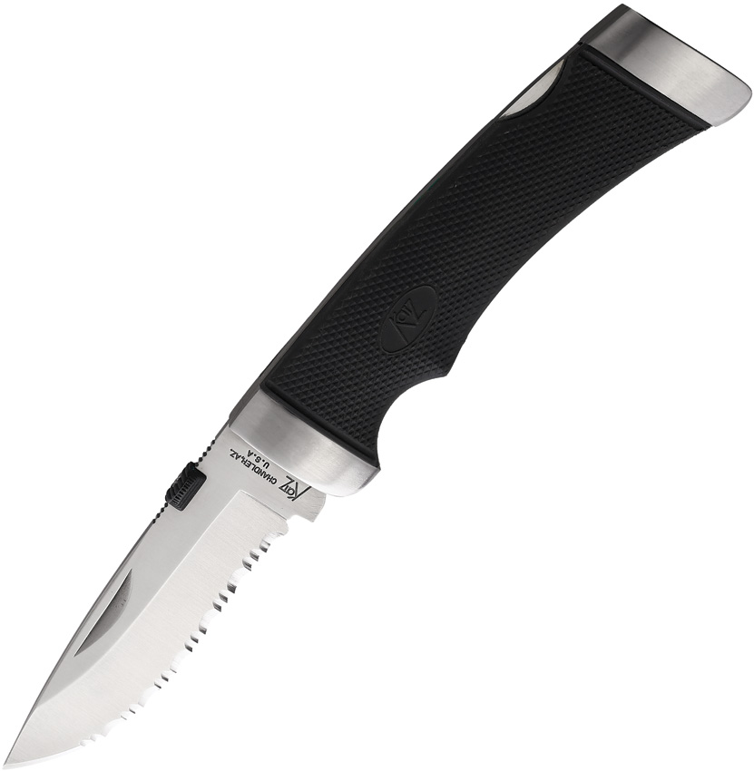 5″ (12.7cm) closed. 4″ (10.16cm) satin finish partially serrated stainless drop point blade. Black Kraton handle. Stainless bolster(s). Thumb disk. Black leather belt sheath. Boxed.