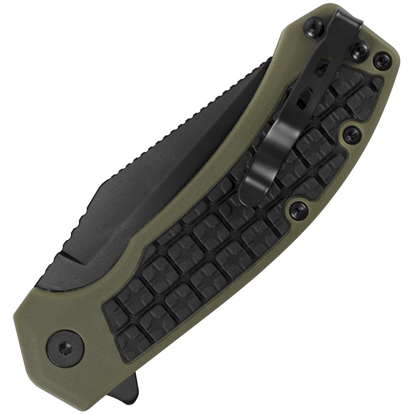 4″ closed. 3″ black oxide coated 8Cr13MoV stainless blade. Green GRN handle with black rubber insert. Extended tang. Pocket clip. Boxed.