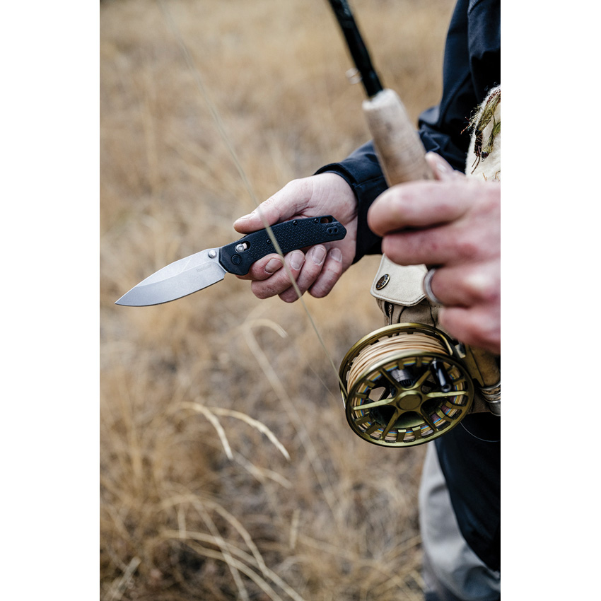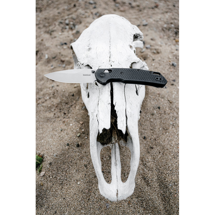 4.38″ (11.13cm) closed. 3.25″ (8.26cm) stonewash finish D2 tool steel blade. Black glass filled nylon handle. Thumb stud. Lanyard hole. Pocket clip. Boxed.