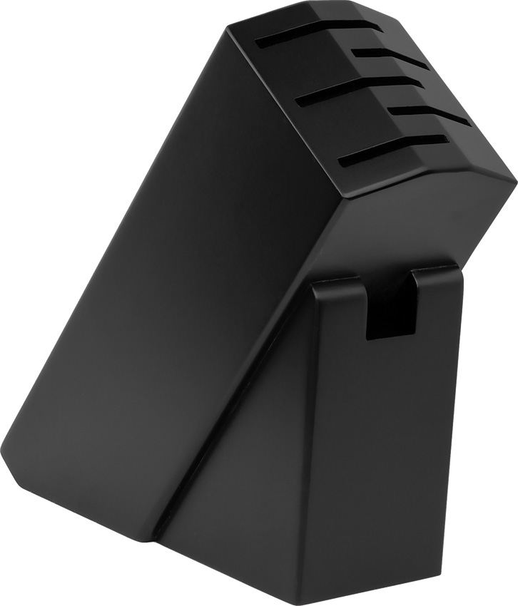 Satin finish 1.4116 stainless blade. Black polypropylene handle. Storage block. Includes: Chef’s with 8″ blade; Bread with 8″ serrated blade; Santoku with 6.5″ hollow ground blade; Utility with 6″ blade; Paring with 3.5″ blade. Boxed.