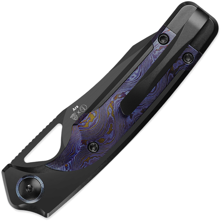 4″ (10.16cm) closed. 3″ (7.62cm) black DLC coated CPM Cru-Wear steel drop point blade. Black titanium handle with Timascus inlay. Thumb pull. Pocket clip. Boxed.