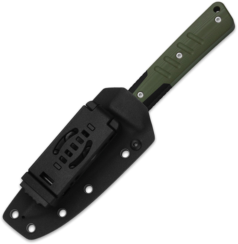 9″ (22.86cm) overall. 4.25″ (10.8cm) satin finish AEB-L stainless modified drop point blade. OD green and black G10 handle. Full tang. Lanyard hole. Black Kydex belt sheath. Boxed.
