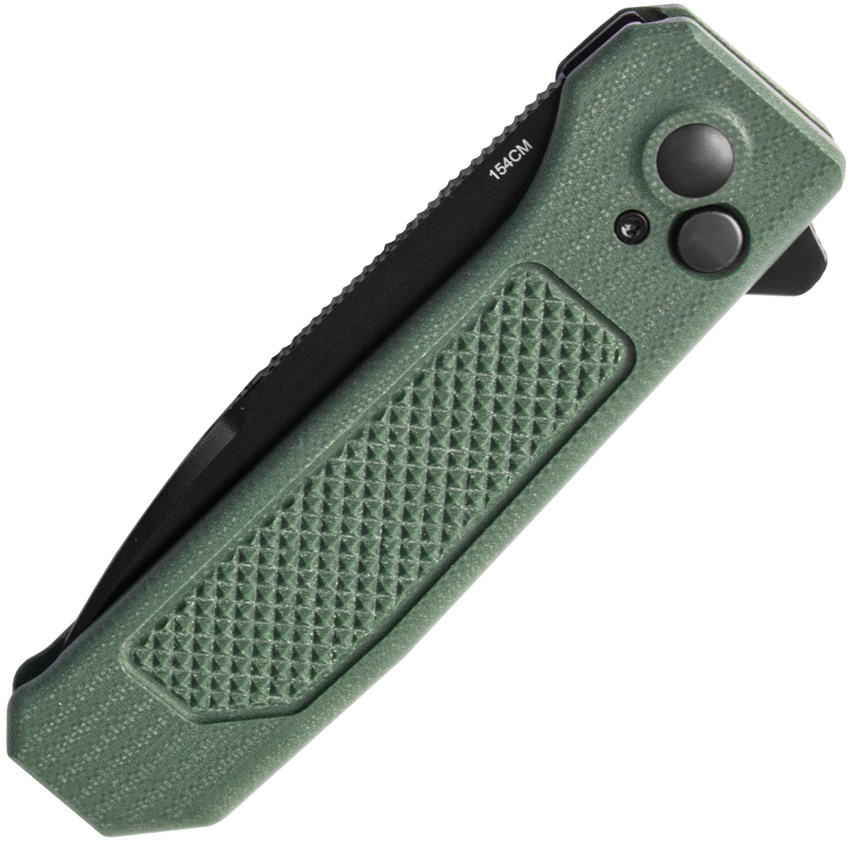 4.5″ (11.43cm) closed. 3.5″ (8.89cm) black finish 154CM stainless drop point blade. OD green G10 handle. Extended tang. Pocket clip. Boxed.