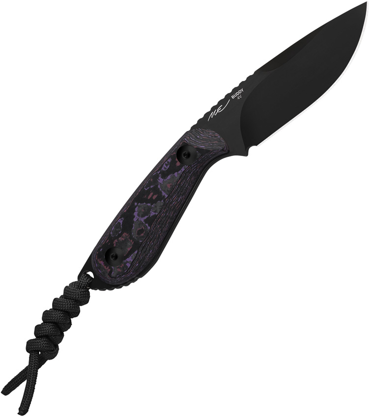 6.25″ (15.88cm) overall. 3″ (7.62cm) black DLC coated CPM-4V tool steel drop point blade. Purple Haze Fat carbon fiber handle. Full, extended tang. Lanyard hole. Black Kydex belt sheath. Boxed.