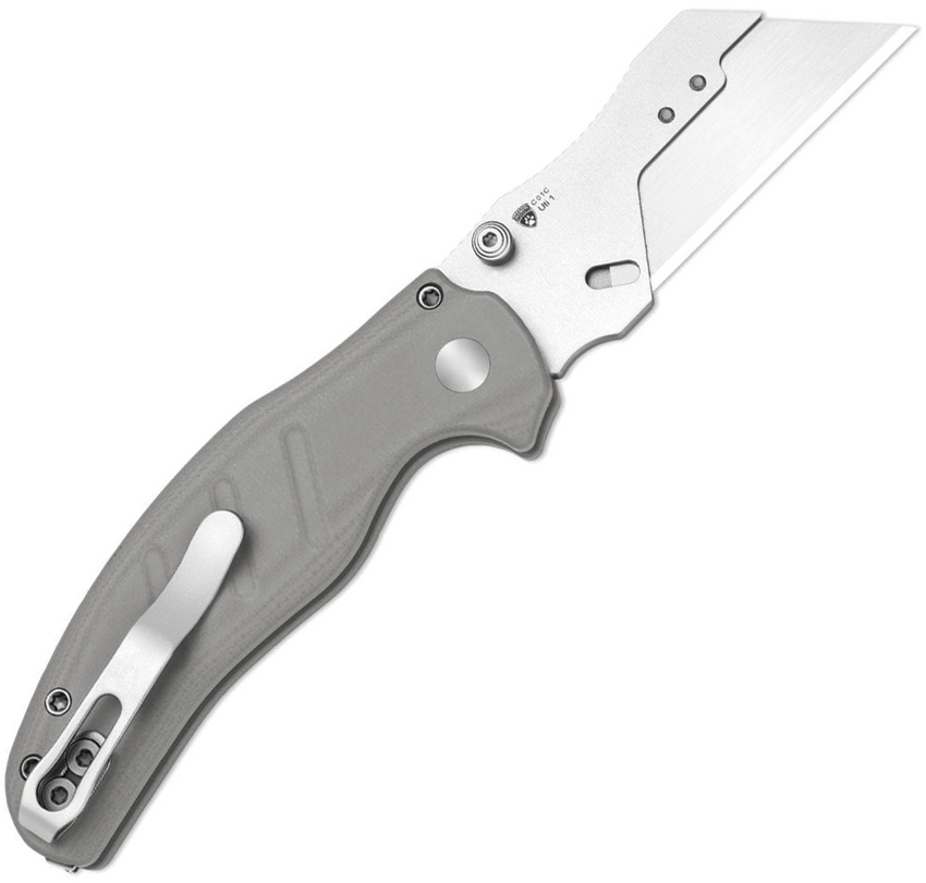 4.13″ (10.49cm) closed. 2.88″ (7.32cm) 5Cr15MoV stainless blade. Gray G10 handle. Pocket clip. Tweezers and toothpick in handle. Snap-in blade system. Comes with six replaceable blades. Satin finish blade holder. Boxed.