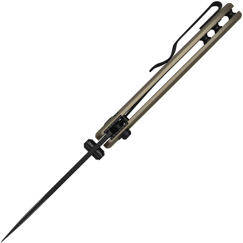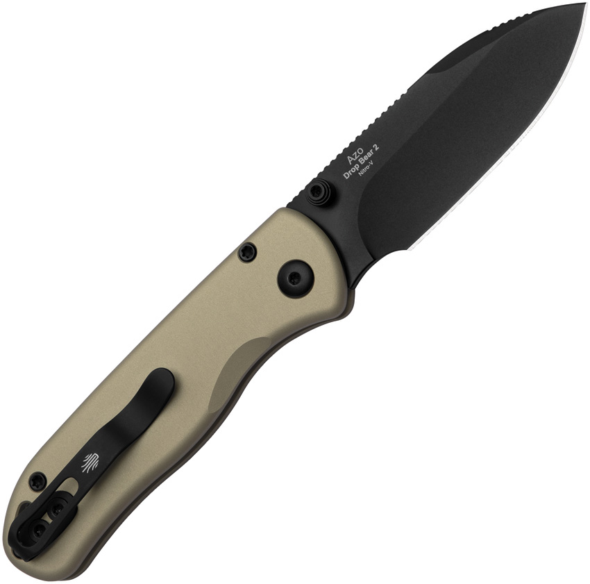 4″ (10.16cm) closed. 3″ (7.62cm) black DLC coated Nitro V steel drop point blade. Tan aluminum handle. Pocket clip. Thumb stud. Lanyard hole. Boxed.