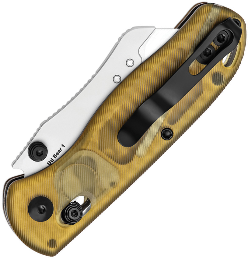 4″ (10.16cm) closed. 2.75″ (6.99cm) blade. Amber PEI handle. Thumb stud. Lanyard hole. Pocket clip. SK5 or 5Cr15 stainless trapezoidal replaceable blade. Toothpick and tweezers in handle. Includes 10 extra blades. Boxed.