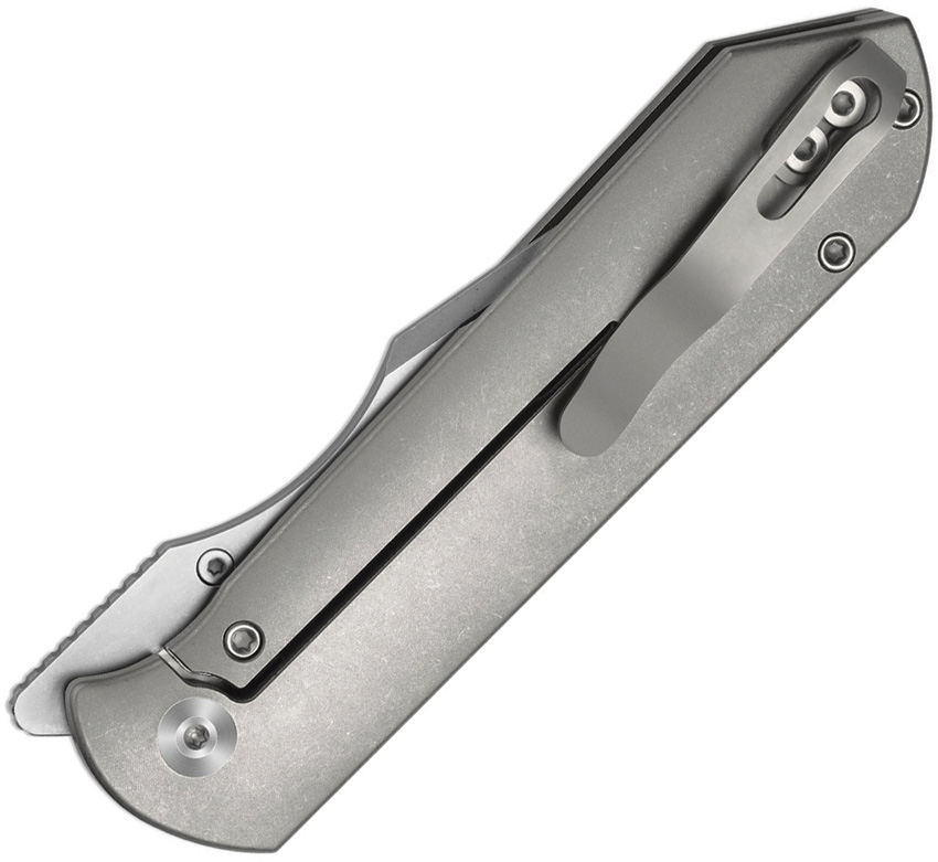 4.63″ (11.76cm) closed. 3.38″ (8.59cm) stonewash and satin finish Elmax steel drop point blade. Gray stonewash finish titanium handle. Thumb stud. Pocket clip. Boxed.