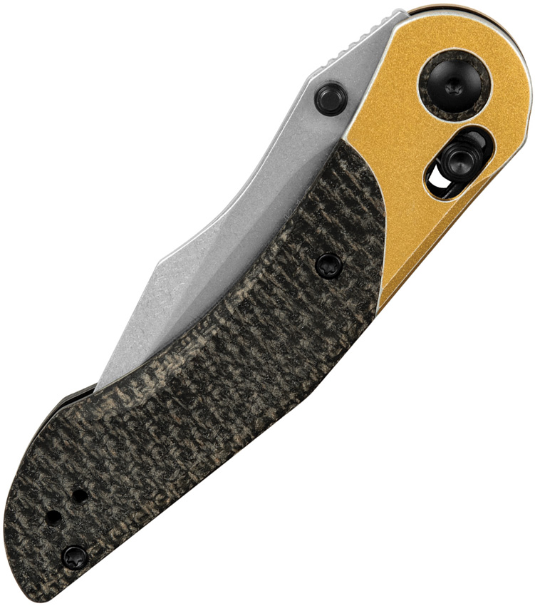 4.38″ (11.13cm) closed. 3.25″ (8.26cm) stonewash finish Nitro V steel blade. Black burlap micarta handle. Thumb stud. Pocket clip. Distressed copper color aluminum bolster. Boxed.