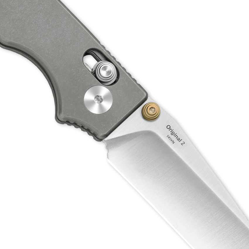 4.13″ (10.49cm) closed. 3.13″ (7.95cm) satin finish S45VN stainless modified drop point blade. Gray stonewash finish titanium handle. Thumb stud. Pocket clip. Boxed.