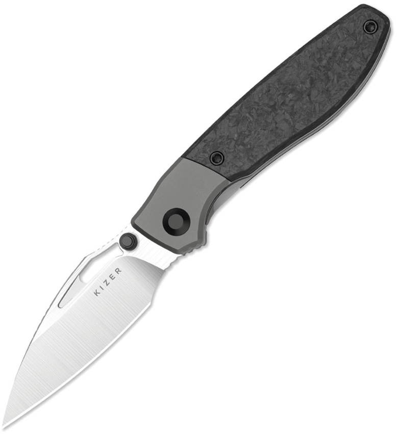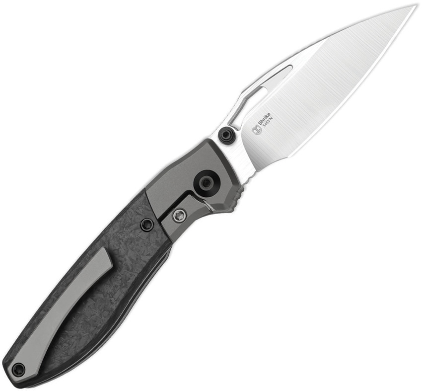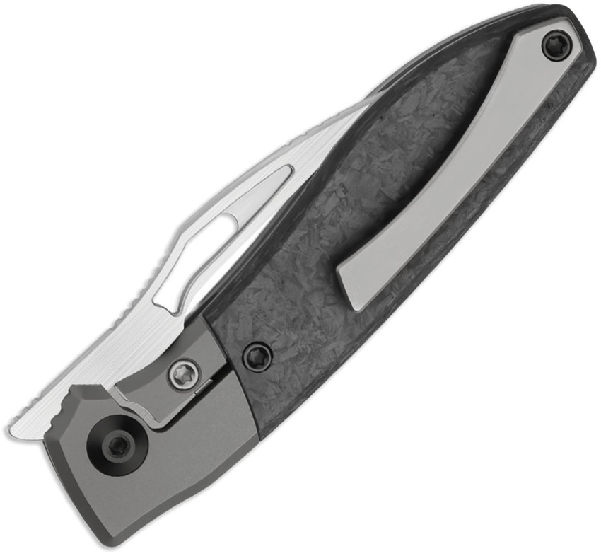 3.63″ (9.22cm) closed. 2.75″ (6.99cm) brushed finish S45VN stainless drop point blade. Dark gray titanium handle with carbon fiber inlay. Thumb stud. Thumb pull. Pocket clip. Boxed.