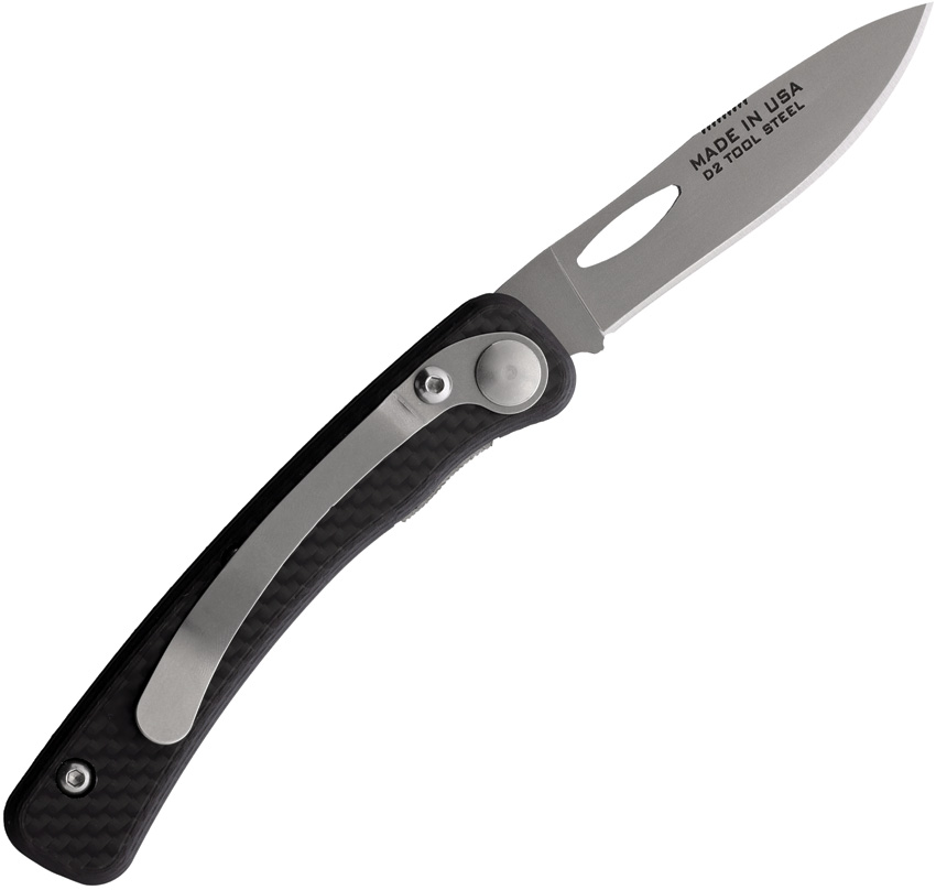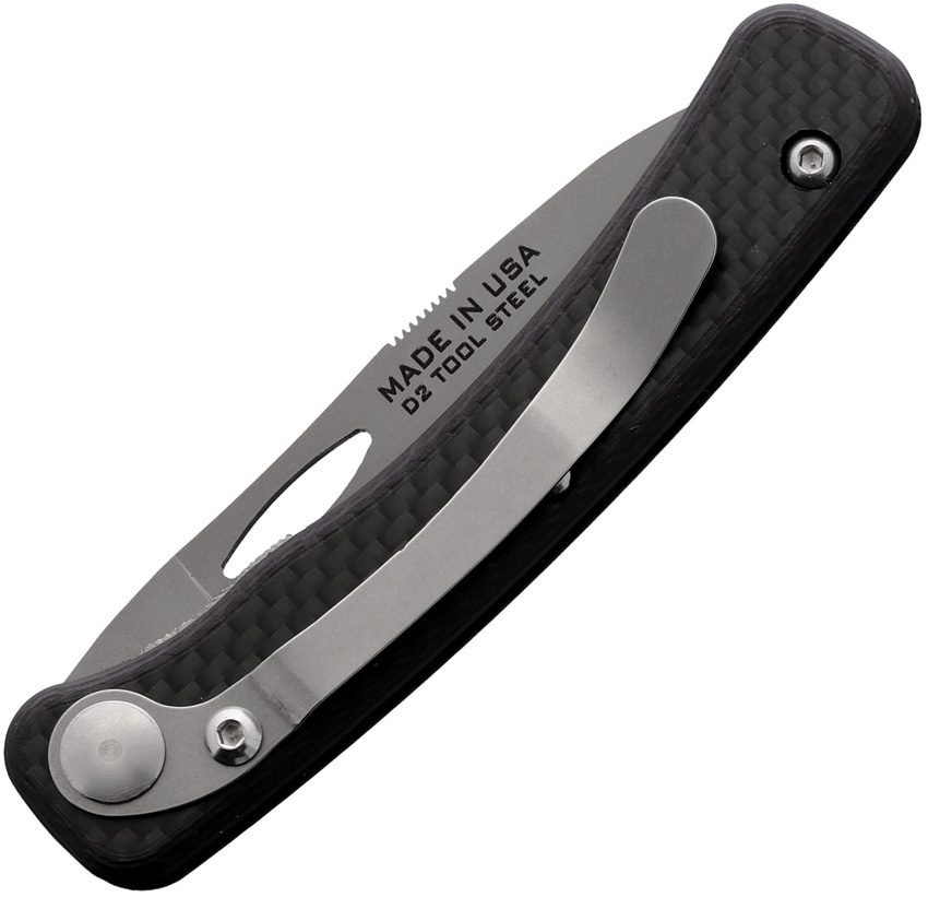 4.25″ (10.8cm) closed. 3″ (7.62cm) bead blast finish D2 tool steel blade. Black carbon fiber handle. Pocket clip. Thumb pull. Boxed.