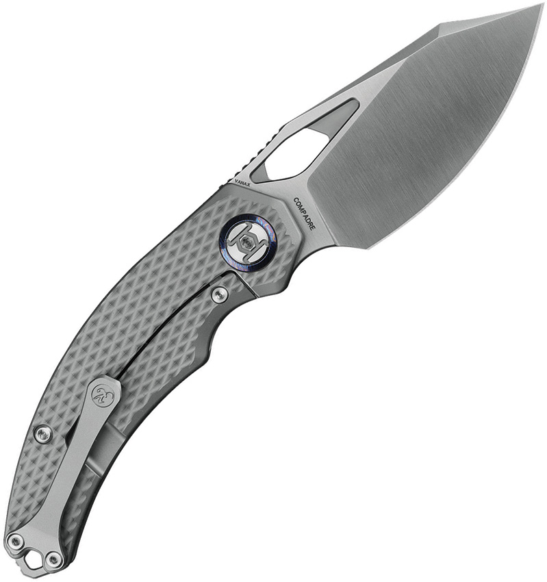 4.13″ (10.49cm) closed. 3″ (7.62cm) satin finish Vanax steel blade. Diamond texture titanium handle. Thumb pull. Pocket clip. Extended tang. Boxed.
