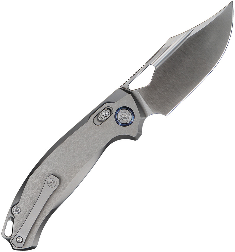 5.13″ (13.03cm) closed. 3.75″ (9.53cm) satin finish Elmax steel clip point blade. Orange peel titanium handle. Thumb pull. Pocket clip. Lanyard hole. Boxed.