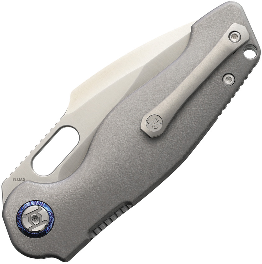 4.75″ (12.07cm) closed. 3.63″ (9.22cm) satin finish Elmax steel drop point blade. Orange peel titanium handle. Lanyard hole. Pocket clip. Thumb pull. Boxed.