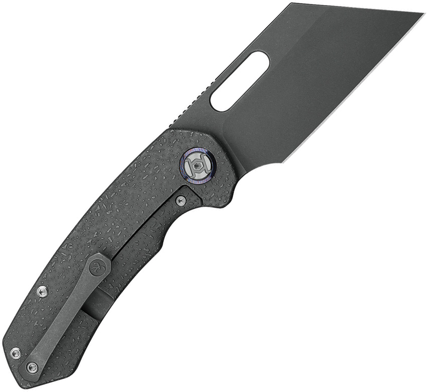 4.25″ (10.8cm) closed. 3.25″ (8.26cm) gray stonewash finish cleaver style blade. Raindrop stonewash finish titanium handle. Thumb pull. Lanyard hole. Pocket clip. Extended tang. VANCRON steel blade. Boxed.