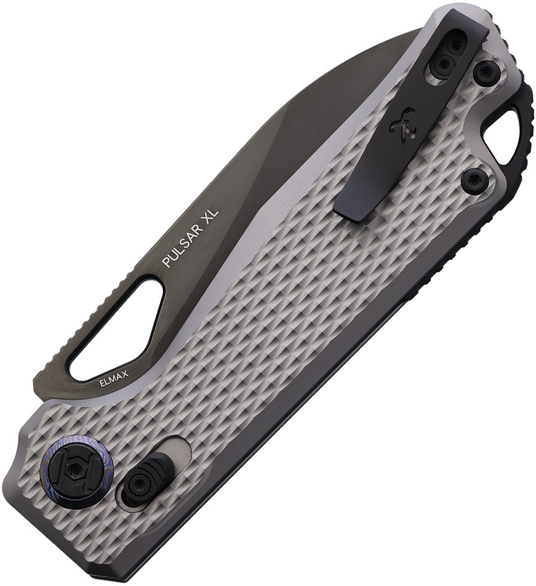5″ (12.7cm) closed. 3.88″ (9.86cm) black DLC coated Elmax steel drop point blade. Gray textured titanium handle. Thumb pull. Lanyard hole. Pocket clip. Boxed.