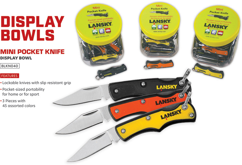 2.25″” closed. 1.25″” satin finish stainless clip point blade. Black synthetic handle with rubber inlay. Bail. Plastic bowl for countertop display. Includes 15 each handle color (yellow; black; orange). Bulk packed.