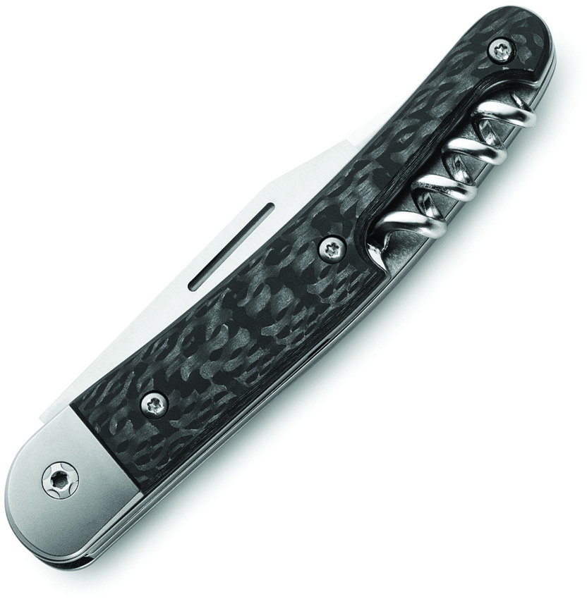 3.88″ (9.86cm) closed. Satin finish Bohler M390 stainless clip blade. Carbon fiber handle. Titanium bolster(s). Bottle opener. Screwdriver tip. Corkscrew. Boxed.