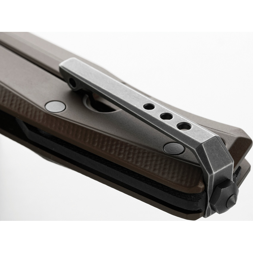 4.63″ (11.76cm) closed. 3.25″ (8.26cm) black stonewash finish Bohler M390 stainless blade. Earth brown aluminum handle. Extended tang. Glass breaker. Lanyard hole. Pocket clip. PVD coated blade. Boxed.