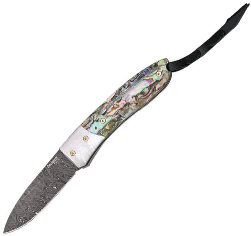 4″ closed lockback. 2 7/8″ Damascus steel drop point blade. Abalone handles with mother of pearl bolster. Fileworked backspring. Lanyard slot with black leather lanyard. Cedar storage block with cardboard sleeve.