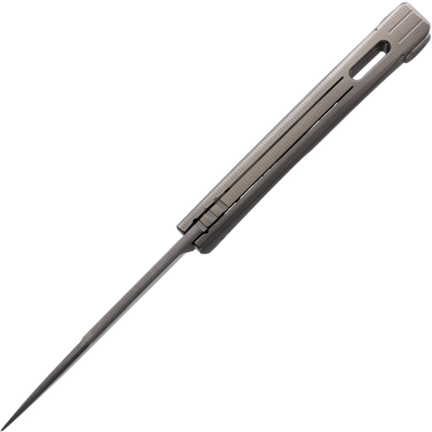 4.13″ (10.49cm) closed. 3.13″ (7.95cm) blade. Gray titanium handle. Pocket clip. Chad Nichols scrambled Damascus blade. Comes in plastic tube.