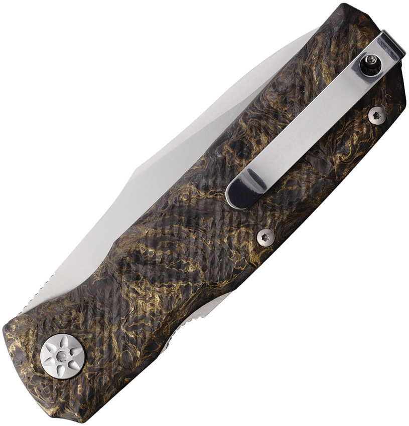 4.13″ (10.49cm) closed. 3.13″ (7.95cm) satin finish Bohler N690 stainless blade. Gold Fat carbon fiber handle. Pocket clip. Boxed.