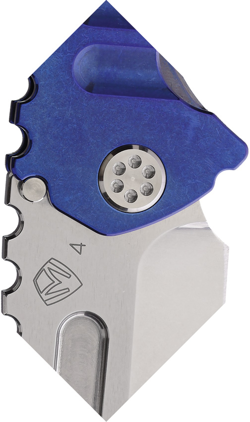 4.5″ (11.43cm) closed. 3.25″ (8.26cm) tumbled finish S45VN stainless drop point blade. Blue anodized titanium handle. Thumb stud. Lanyard hole. Glass breaker. Pocket clip. Water tight case. Boxed.
