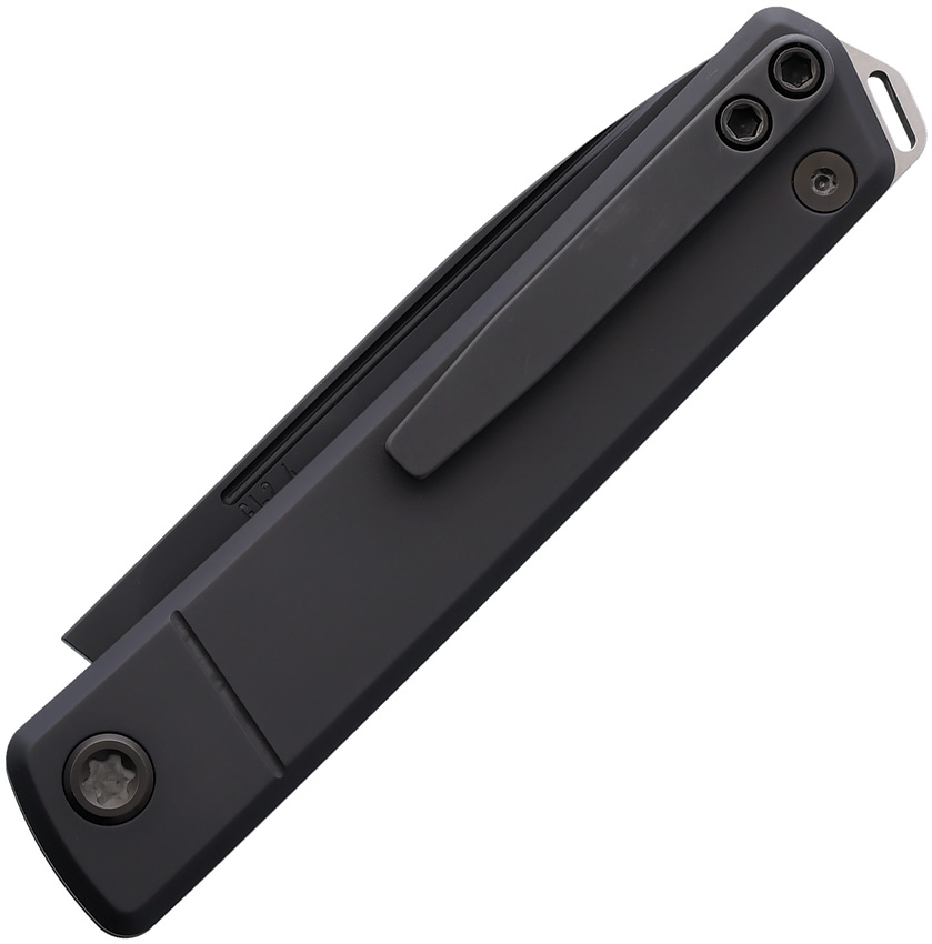 4″ (10.16cm) closed. 3″ (7.62cm) black PVD coated S45VN stainless drop point blade. Black DLC coated titanium handle. Pocket clip. Lanyard hole. Black nylon zippered storage case. Boxed.
