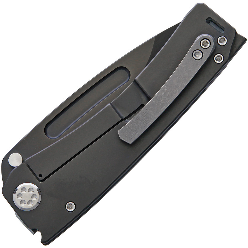 5″ closed. 4″ black PVD coated 3V steel drop point blade. Black PVD coated titanium handle. Thumb stud. Pocket clip. Lanyard hole. Water tight storage case. Boxed.