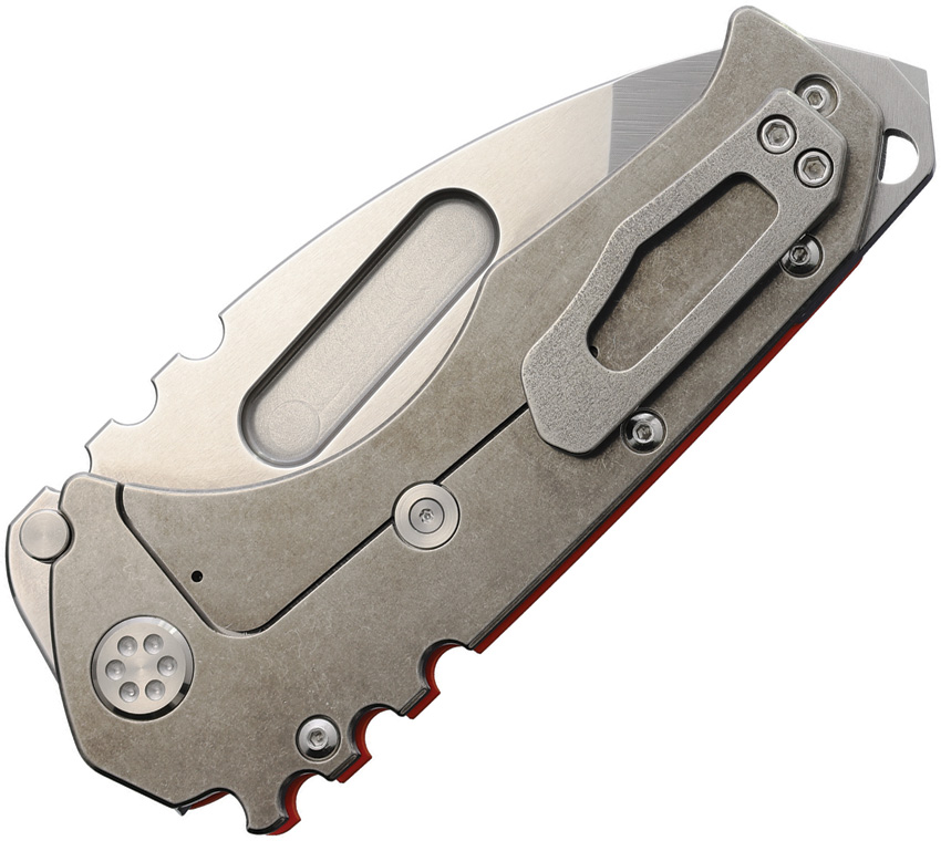 5.25″ (13.34cm) closed. 4″ (10.16cm) tumbled finish S35VN stainless tanto blade. Orange G10 handle with stonewash finish titanium back handle. Glass breaker. Lanyard hole. Pocket clip. Thumb stud. Black nylon zippered storage case. Boxed.