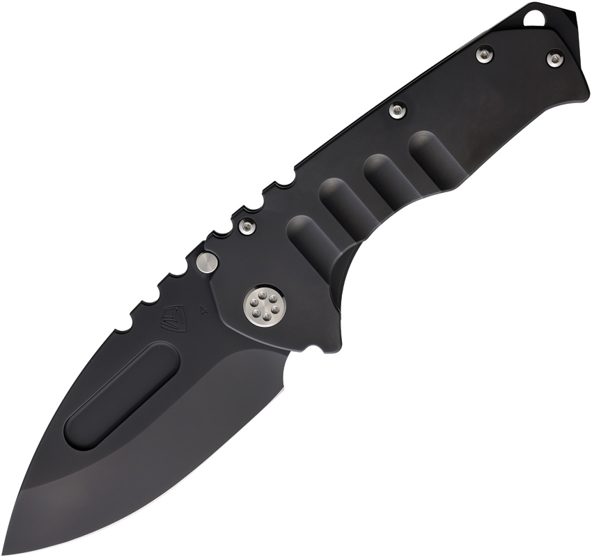 5.25″ (13.34cm) closed. 3.75″ (9.53cm) black DLC coated S45VN stainless drop point blade. Black DLC coated titanium handle. Glass breaker. Lanyard hole. Pocket clip. Thumb stud. Black nylon zippered storage case. Boxed.
