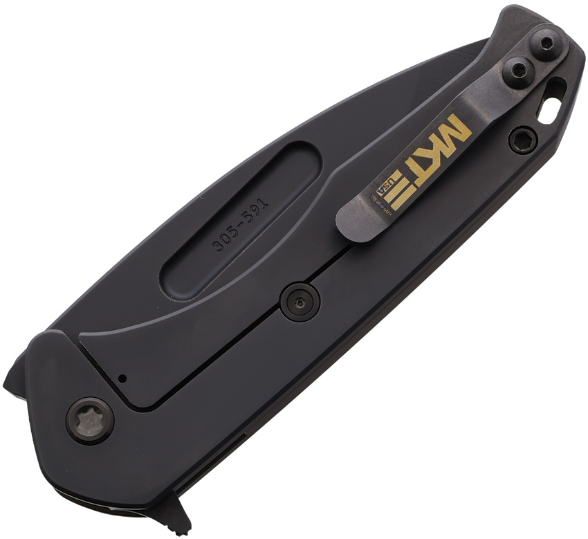 4.38″ (11.13cm) closed. 3.38″ (8.59cm) black DLC coated S45VN stainless tanto blade. Gold PVD coated titanium handle with black back handle. Extended tang. Glass breaker. Lanyard hole. Pocket clip. Water tight case. Boxed.