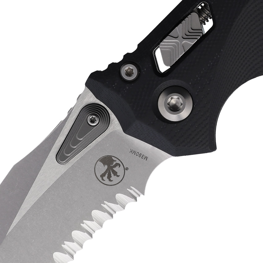 5.38″ (13.67cm) closed. 4″ (10.16cm) stonewash finish partially serrated Bohler M390MK stainless blade. Black G10 handle. Pocket clip. Lanyard hole. Frag pattern handle. Unique thumb stud opener with ball bearing pivot. Microtech item #137RL-11FRGTBK. Boxed.