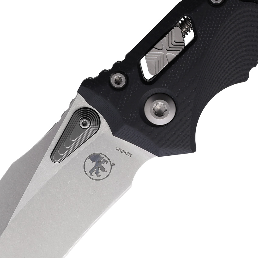 5.38″ (13.67cm) closed. 4″ (10.16cm) stonewash finish Bohler M390MK stainless blade. Black G10 handle. Pocket clip. Lanyard hole. Frag pattern handle. Unique thumb stud opener with ball bearing pivot. Microtech item #137RL-10FRGTBK. Boxed.