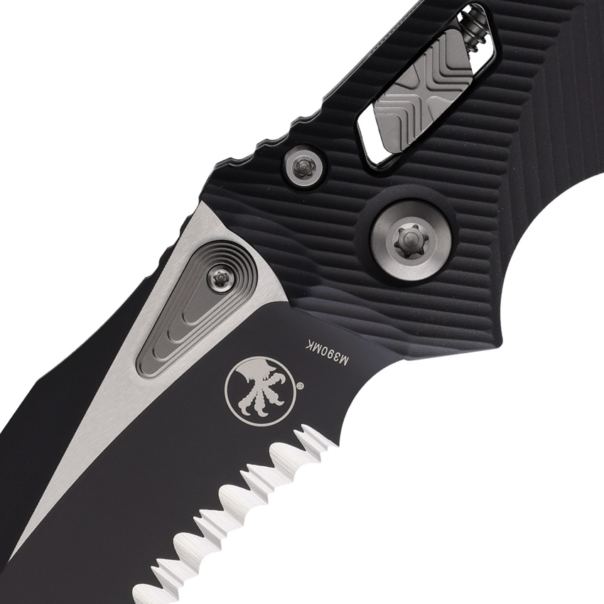 5.38″ (13.67cm) closed. 4″ (10.16cm) two-tone finish partially serrated Bohler M390MK stainless blade. Black aluminum handle. Pocket clip. Lanyard hole. Unique thumb stud opener with ball bearing pivot. Microtech item #137RL-2FL. Boxed.