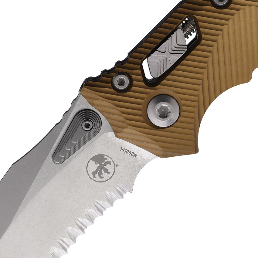 5.38″ (13.67cm) closed. 4″ (10.16cm) stonewash finish partially serrated Bohler M390MK stainless blade. Tan fluted aluminum handle. Pocket clip. Lanyard hole. Thumb stud. Microtech item #137RL-11FLTA. Boxed.