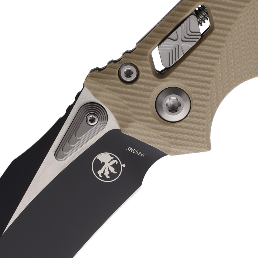 5.38″ (13.67cm) closed. 4″ (10.16cm) two-tone finish Bohler M390MK stainless blade. Tan G10 handle. Pocket clip. Lanyard hole. Unique thumb stud opener with ball bearing pivot. Microtech item #137RL-1FLGTTA. Boxed.
