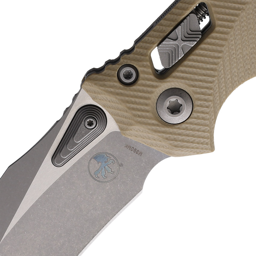 5.38″ (13.67cm) closed. 4″ (10.16cm) Apocalyptic finish Bohler M390MK stainless blade. Tan G10 handle. Pocket clip. Lanyard hole. Unique thumb stud opener with ball bearing pivot. Microtech item #137RL-10APFLGTTA. Boxed.