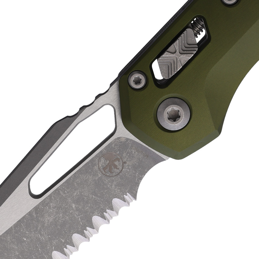 5″ (12.7cm) closed. 3.75″ (9.53cm) Apocalyptic finish serrated Bohler M390MK stainless sheepsfoot blade. OD green aluminum handle. Thumb pull. Lanyard hole. Pocket clip. Boxed.