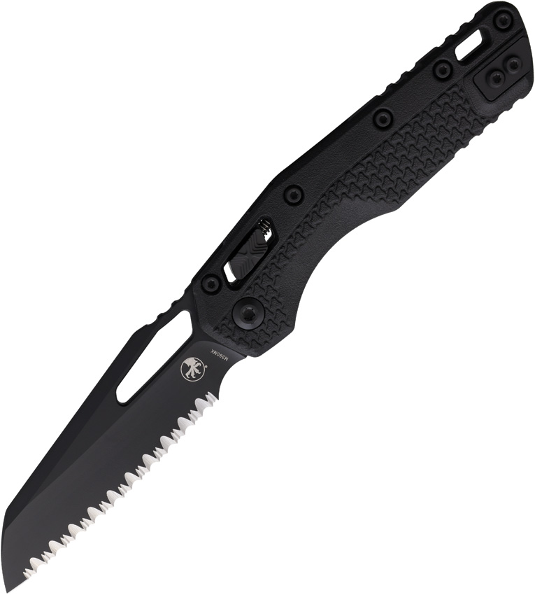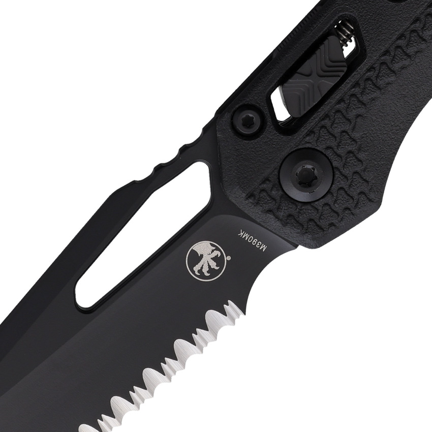5″ (12.7cm) closed. 3.75″ (9.53cm) black coated serrated Bohler M390MK stainless sheepsfoot blade. Black polymer handle. Lanyard hole. Pocket clip. Thumb pull. Boxed.