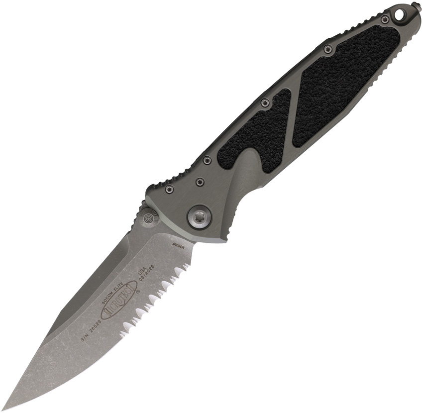 5.13″ (13.03cm) closed. 4″ (10.16cm) Apocalyptic finish partially serrated premium steel blade. Gray aluminum handle with black traction insert. Thumb stud. Lanyard hole. Glass breaker. Pocket clip. Boxed.